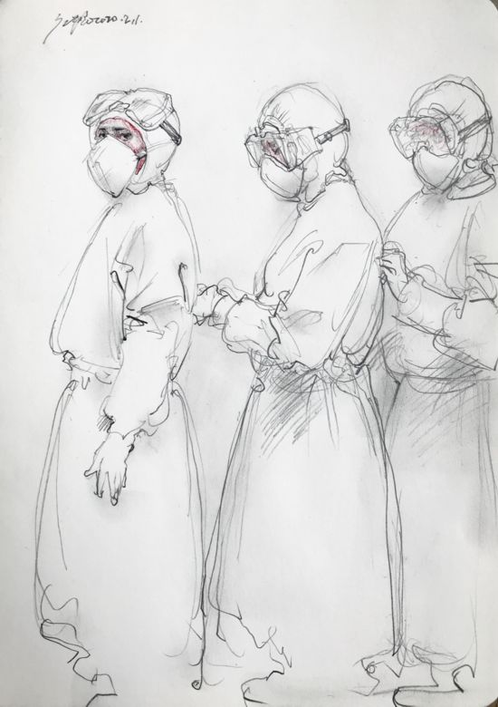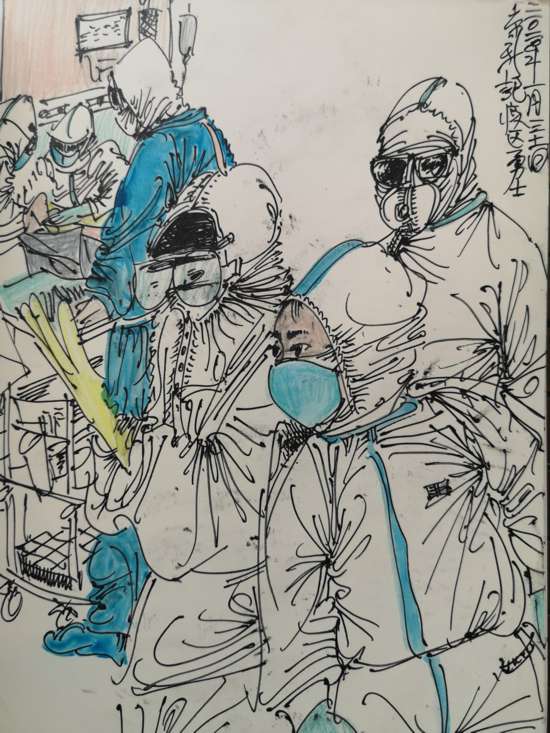 “戰(zhàn)疫”一線的勇士們每天都在深深地感動著我們,他們在用自己的生命與肆虐的病毒抗爭。我每天以最樸素、最便捷的速寫繪畫方式,記錄和表達對他們的由衷敬意和祝福。我們信念堅定、眾志成城,與武漢同心協(xié)力,戰(zhàn)勝病毒!