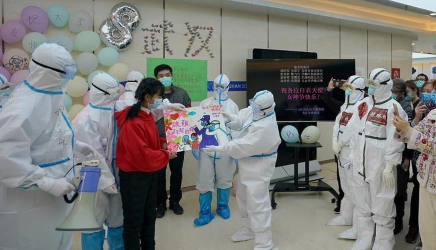 3月8日,在武昌方艙醫(yī)院,劉嘉宇(上中)向醫(yī)護人員送上自己創(chuàng)作的繪畫作品后,大家一起合影。2月中下旬,11歲的劉嘉宇不幸感染新冠肺炎住進武昌方艙醫(yī)院。