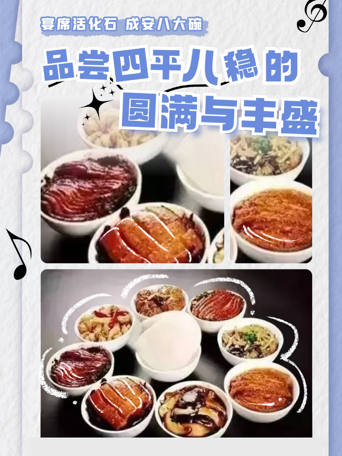 成安八大碗其形制與儒家、道家文化中對數(shù)字“八”的崇拜緊密相連,八只蒸碗齊齊上桌,象征著四平八穩(wěn)的圓滿與豐盛。“八大碗”的構(gòu)成與烹飪技藝同樣獨具匠心。其菜品葷素搭配,囊括了酥肉、蝦米白菜、酥雞塊、魚塊、海帶豆腐、丸子等代表性菜肴。