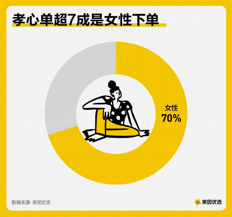 而熱帶水果成為了子女們下單的第一選擇,除此以外,子女們還給父母準(zhǔn)備了家用蔬菜、米面糧油、家居日用等商品。女兒和離鄉(xiāng)青年們則是孝心單的重度用戶,超過三成的孝心單為95后下單,而超過七成“孝心單”來源于女兒下單。