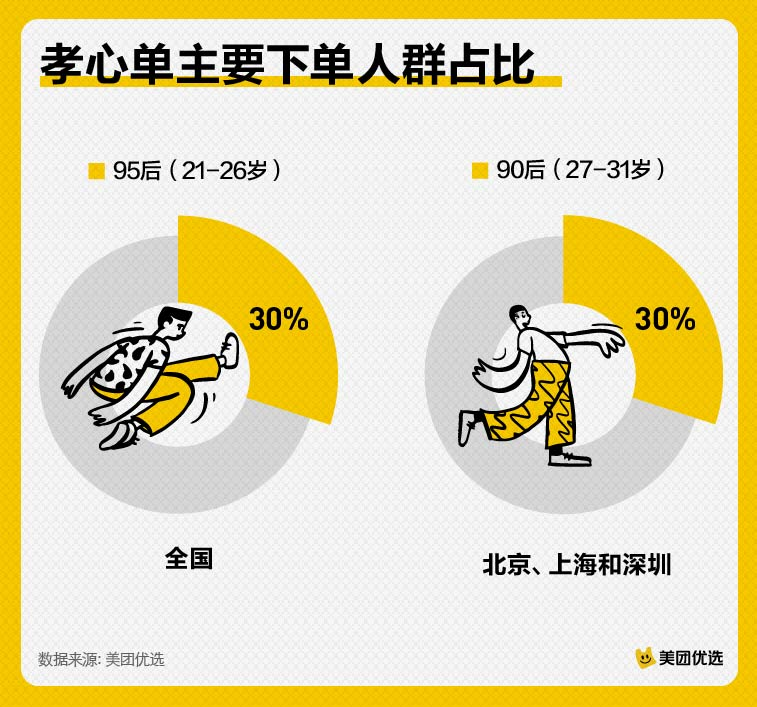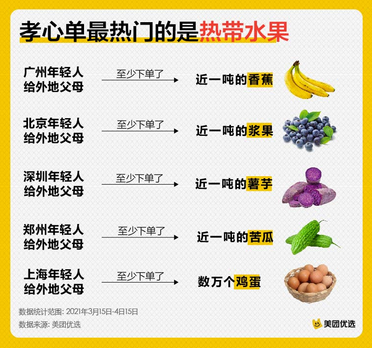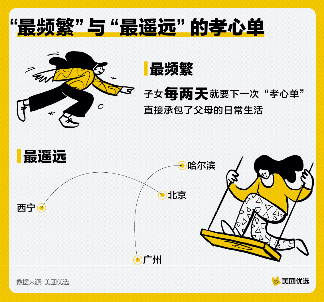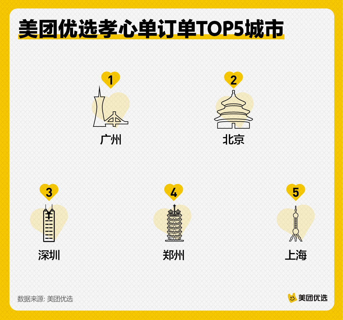 根據(jù)美團(tuán)優(yōu)選數(shù)據(jù)顯示:全國“孝心單”單月訂單數(shù)就超過百萬,廣州、北京、深圳、鄭州、上海、杭州、西安、佛山、沈陽、南京等一線及新一線城市成為了孝心單下單前十的城市。