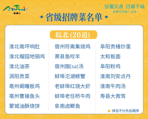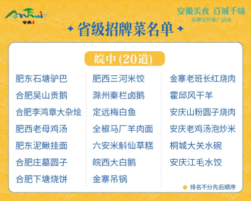 本次活動(dòng)采取省市縣三級(jí)聯(lián)動(dòng)的方式,各級(jí)餐飲行業(yè)協(xié)會(huì)、餐飲企業(yè)廣泛參與。各市及相關(guān)縣(市、區(qū))共推薦特色菜品千余道,且每道菜均有對(duì)應(yīng)推薦品嘗點(diǎn)。省文化和旅游廳在市縣推薦的基礎(chǔ)上,邀請(qǐng)省內(nèi)餐飲行業(yè)專家,組織評(píng)審研討,從地方特色、制作工藝、美食知名度、文化傳承性、旅游資源相關(guān)性等方面綜合評(píng)定,推薦省級(jí)招牌菜63道(分皖北、皖中、皖南3個(gè)片區(qū))、市級(jí)招牌菜160道、縣級(jí)招牌菜747道。