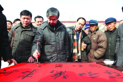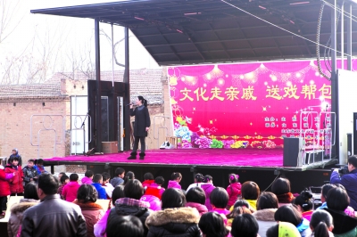 1月24日,山東省文化廳組織文化下鄉(xiāng)團(tuán)隊(duì)赴菏澤市鄆城縣黃集鄉(xiāng)5個(gè)“第一書(shū)記”幫包村,舉辦了“文化走親戚送戲幫包村”活動(dòng)。山東省呂劇院、山東省柳子劇團(tuán)等山東省直文藝單位的百余位藝術(shù)家為當(dāng)?shù)厝罕娝蜕狭司实奈乃囇莩觯?0多位山東省知名書(shū)法家為村民們現(xiàn)場(chǎng)書(shū)寫春聯(lián)300余副。記者在活動(dòng)現(xiàn)場(chǎng)看到,村里的計(jì)劃生育室被臨時(shí)改成了演員化裝室,為抵御嚴(yán)寒,化完裝的演員們就在屋里來(lái)回走動(dòng)。近百平方米的屋子里,一個(gè)“小太陽(yáng)”取暖器是唯一的取暖設(shè)備。