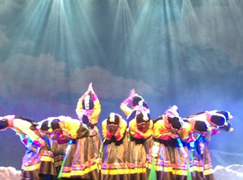 藏族姑娘表演舞蹈《湖映彩虹》。劉明明 攝 10月1日晚7:30,“十藝節(jié)”祝賀演出——大型民族歌舞劇《碧海云天·金銀灘》在濟(jì)南歷山劇院首演。其中的男子群舞《腳步》展現(xiàn)了藏族男子的厚重精神,而女子群舞《風(fēng)吹過山崗》則用歡快、活潑的表現(xiàn)手法展現(xiàn)出藏族女子的熱情開朗。