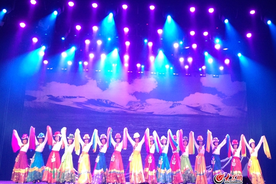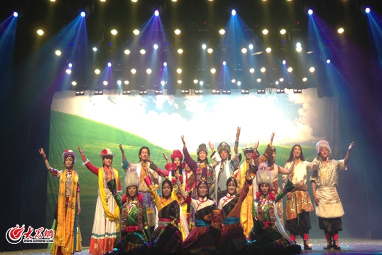 10月1日晚7:30,“十藝節(jié)”祝賀演出——大型民族歌舞劇《碧海云天·金銀灘》在濟(jì)南歷山劇院首演。青海海北州民族歌舞團(tuán)的演員們用激情四射的歌舞表演,為現(xiàn)場觀眾奉上了一場視聽盛宴。