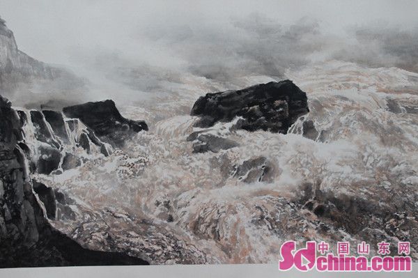 記者在現(xiàn)場采訪了山東省齊魯書畫研究院的吳恩俠畫師,據(jù)吳畫師介紹,《黃河萬里圖》在構(gòu)圖、筆墨、色彩上都非常講究,使整幅畫卷看起來靈動灑脫,氣勢磅礴。談到《黃河萬里圖》創(chuàng)作的意義,吳畫師說道:“之前張大千創(chuàng)作過《長江萬里圖》,以黃河沿岸為背景創(chuàng)作巨幅畫卷這是首次,這可以稱得上是中國山水畫領(lǐng)域的又一個創(chuàng)舉!