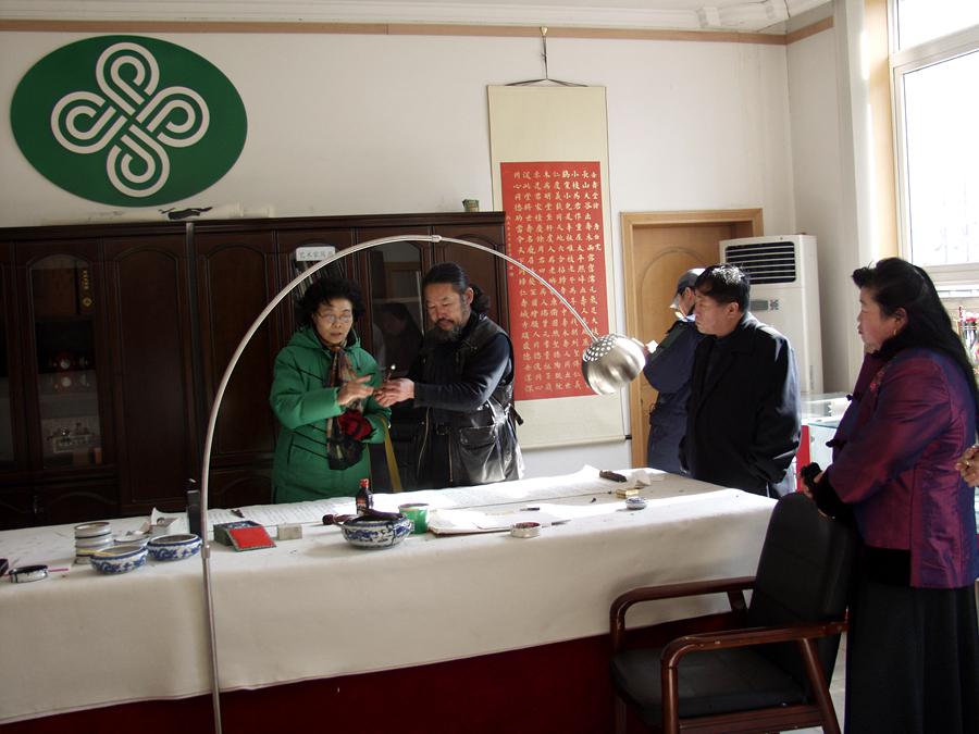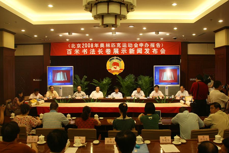 圖為申奧報(bào)告百米書法長(zhǎng)卷新聞發(fā)布會(huì)現(xiàn)場(chǎng)留影