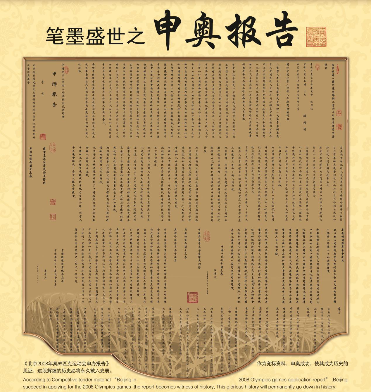 《北京2008年奧林匹克運(yùn)動(dòng)會(huì)申辦報(bào)告》由著名畫家朱明德與北京大運(yùn)河翰林文化開發(fā)中心董事長(zhǎng)谷建華共同策劃創(chuàng)作,運(yùn)用百米書法長(zhǎng)卷的形式,制成典冊(cè),既可存史,又利收藏。