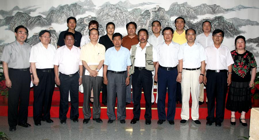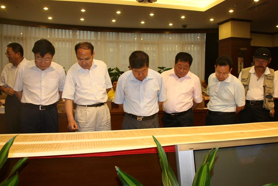 圖為時(shí)任北京市政協(xié)領(lǐng)導(dǎo)觀看申奧報(bào)告百米書法長(zhǎng)卷留影