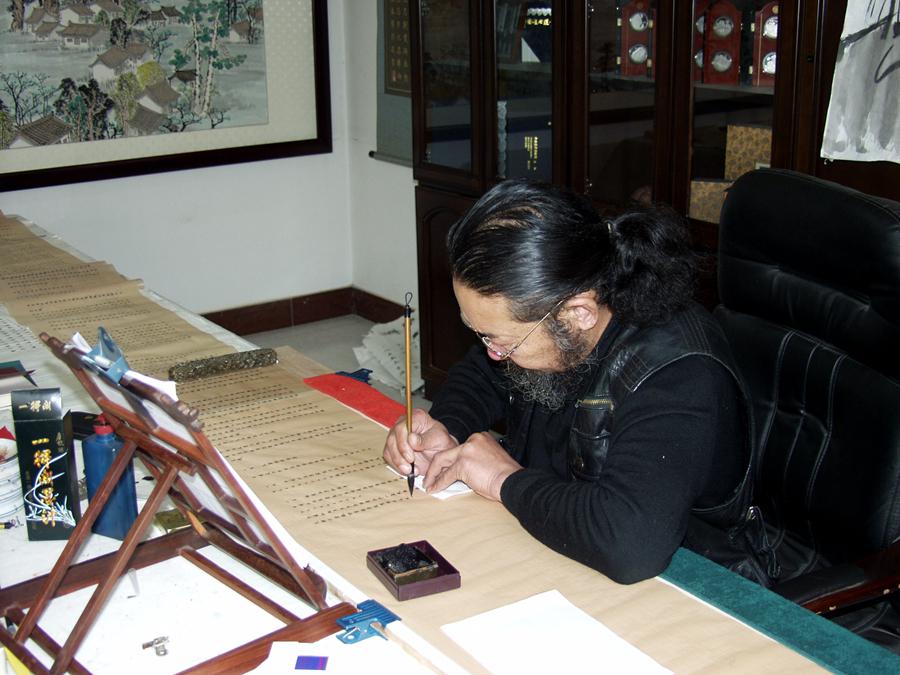 圖為申奧報(bào)告百米書法長(zhǎng)卷創(chuàng)作過程留影