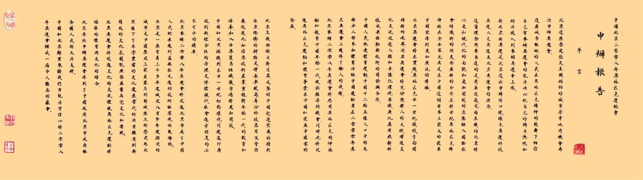 《申奧報(bào)告》長(zhǎng)卷由北京大運(yùn)河翰林文化開發(fā)中心制作,特邀資深書法家曹興國(guó)先生,按古代典籍格式,用六至八毫米標(biāo)準(zhǔn)小楷書法抄錄在絹上。曹興國(guó)先生以非凡的毅力和功力,歷時(shí)三個(gè)多月完成作品。他的小楷書法筆墨濃淡結(jié)合,章法轉(zhuǎn)折清楚,筆路清晰可辨,可嘉可敬!