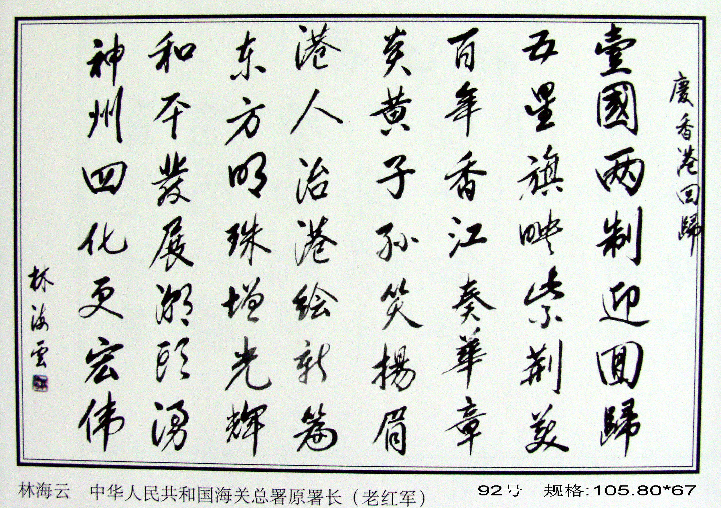 為了留住這一歷史性時(shí)刻,也為了見證香港這百年滄桑的歷史,原國(guó)務(wù)院老干部局、中國(guó)世界民族文化交流促進(jìn)會(huì)藝術(shù)委員會(huì)、中國(guó)政策科學(xué)研究會(huì)老年政策委員會(huì)、北京大運(yùn)河翰林文化開發(fā)中心共同邀請(qǐng)四百多位老領(lǐng)導(dǎo)、老將軍、老書畫藝術(shù)家、社會(huì)知名人士及優(yōu)秀中青年畫家,揮毫潑墨,創(chuàng)作了《迎香港回歸首都百名老人書畫百米長(zhǎng)卷》,征集了四百多幅精美作品。同時(shí),精選不同藝術(shù)特色和風(fēng)格的作品,裝裱成卷,以珍藏這筆巨大的精神文化財(cái)富。