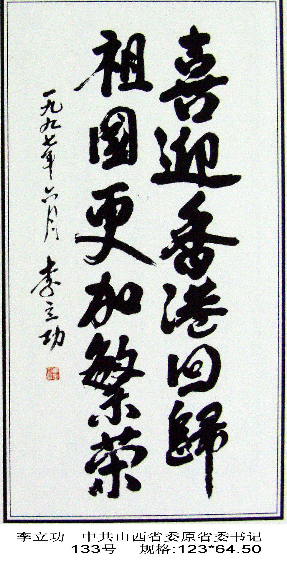 為了留住這一歷史性時刻,也為了見證香港這百年滄桑的歷史,原國務院老干部局、中國世界民族文化交流促進會藝術委員會、中國政策科學研究會老年政策委員會、北京大運河翰林文化開發(fā)中心共同邀請四百多位老領導、老將軍、老書畫藝術家、社會知名人士及優(yōu)秀中青年畫家,揮毫潑墨,創(chuàng)作了《迎香港回歸首都百名老人書畫百米長卷》,征集了四百多幅精美作品。同時,精選不同藝術特色和風格的作品,裝裱成卷,以珍藏這筆巨大的精神文化財富。