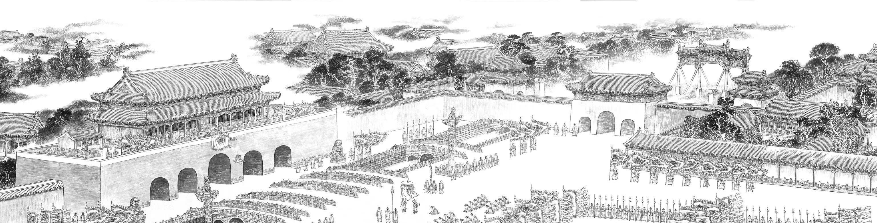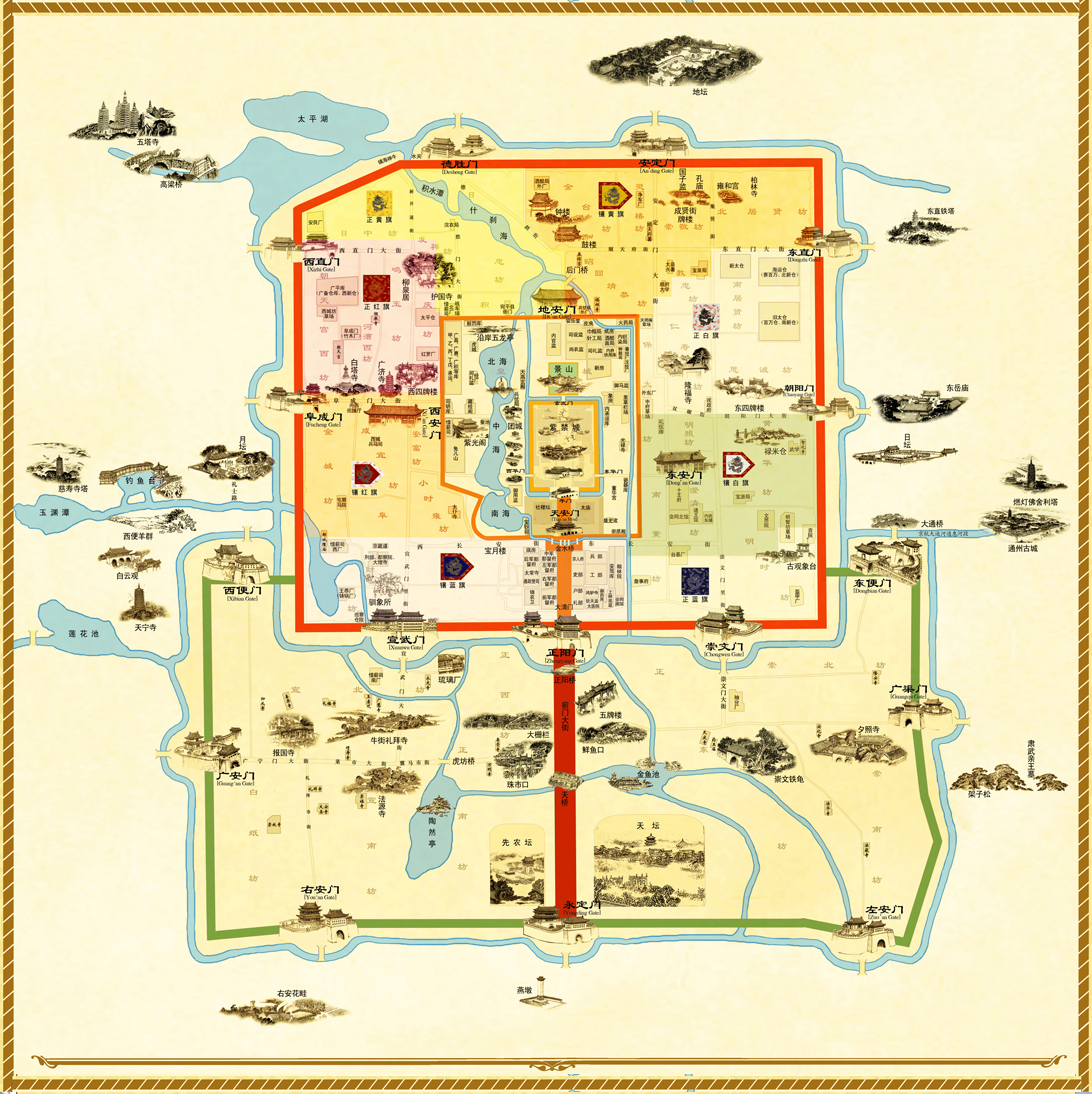 《京門九衢圖》所展現(xiàn)的老北京城以宮城為核心,宮城中的中軸線縱貫?zāi)媳保谥休S線兩側(cè),一些壇廟、寺觀、苑林、府第、胡同以及大片四合院民居依次對(duì)稱布局。格局嚴(yán)謹(jǐn)、層次分明形成了這座著名都城獨(dú)具特色的整體風(fēng)貌。