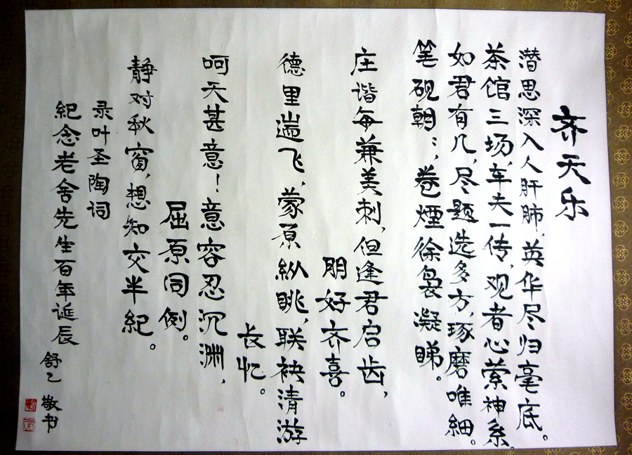 這次活動的舉辦,正直立春時節(jié),為的是紀(jì)念新中國第一位獲得“人民藝術(shù)家”稱號的作家老舍先生誕辰100周年。此次書畫創(chuàng)作活動由百余位書畫名家共創(chuàng)作了一百多幅書畫佳作,老舍愛人胡絜青女士及老舍之子舒乙先生親自為活動題詞。一幅幅書畫作品散發(fā)著清新的墨香,飽含著濃濃的激情、滿滿的熱情。作品題材廣泛,風(fēng)格多樣,內(nèi)容豐富,從不同的視角,運(yùn)用不同的藝術(shù)手法,既有對人民藝術(shù)家老舍先生的深深懷念,也有對新時代美好生活的向往、追求和祝福。