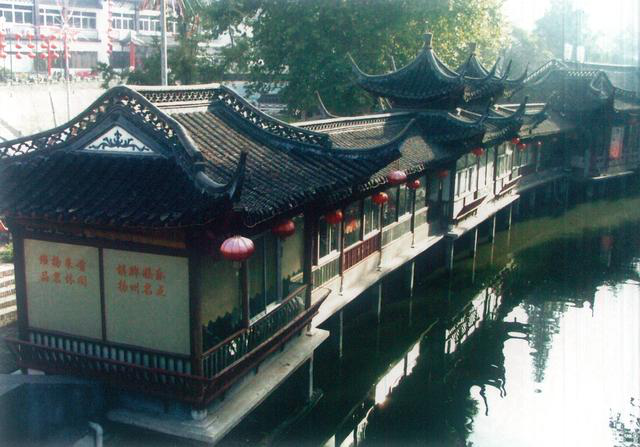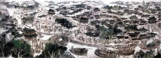 唐白居易《長相思》詞里“汴水流,泗水流,流到瓜洲古渡頭,吳山點點愁”的瓜洲,河上有石閘一道,幾條河交匯,石護岸高陡。河中帆檣叢立,船艙滿載貨物。岸上木垛、茶箱、鹽袋碼放整齊,馬車停歇裝貨,擔筐商販涌流,牙行人忙個不停,間有幾多文官武士、富商艷婦、學子儒生直立漫步,顯然是個碼頭。瓜洲驛里外院分明,門樓院墻高大,告訴人們這里就是大江北岸揚州城郊的爪洲古渡。原是江中一個小村稱瓜洲,狀如瓜子故名,是揚子江沙磧淤成。