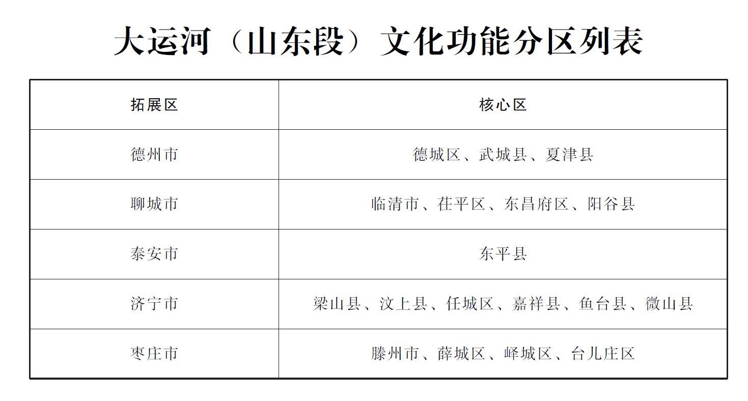 圖為大運河(山東段)文化功能分區(qū)列表,來自《山東省大運河文化保護傳承利用實施規(guī)劃》