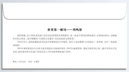 (自主開(kāi)發(fā)的雞鳴驛特色紀(jì)念封,由國(guó)家郵政郵政集團(tuán)公司郵票印制局印刷,并加蓋紀(jì)念戳及1995年8月發(fā)行的《古代驛站·雞鳴山驛》紀(jì)念郵票一枚,可以郵寄遠(yuǎn)方親人好友,傳達(dá)問(wèn)候,也可收藏)