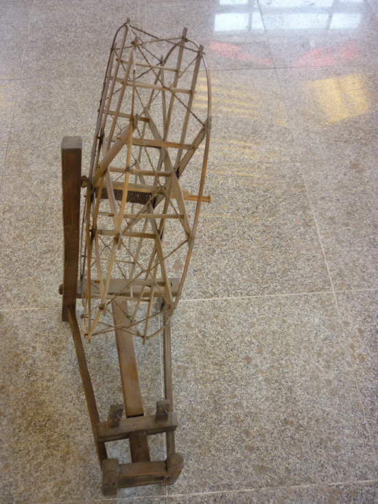 線繩固定的輻條間隔60度,呈張開的傘骨狀。軸的兩“肩”卡住軸兩邊的兩組輻條,使其不能會合。線繩把兩組輻條呈“之”字形相間張緊,輻條略向內(nèi)彎曲。張緊的“之”字形的線繩是輪的“輞”,輞上掛著傳動繩(俗稱“弦”),軸部加少量潤滑油。