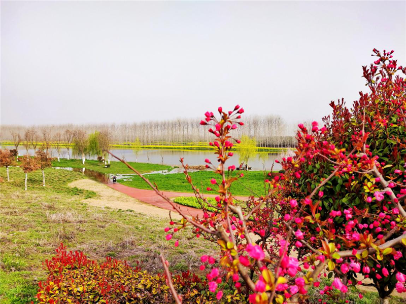 濱河公園河水清如翡翠,河邊菜花金黃,新柳輕拂碧波。