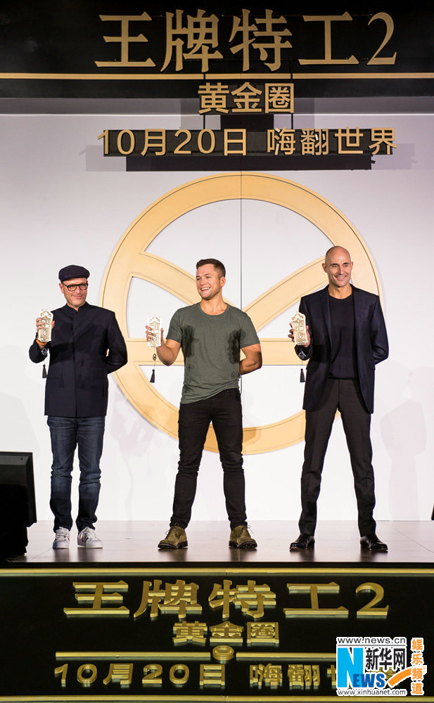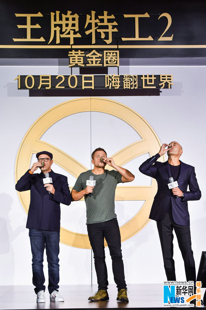 10月20日,好萊塢動作冒險巨制《王牌特工2:黃金圈》主創(chuàng)來滬,一連串驚喜輪番轟炸,演繹“王牌中國熱”!前有兩位主演塔隆·埃格頓、馬克·斯特朗隨性亮相機(jī)場,兩人完美演繹 “鄰家少年感”與“長腿大叔風(fēng)”,超萌反差爆紅網(wǎng)絡(luò),引發(fā)粉絲狂贊;繼而入鄉(xiāng)隨俗接受“黃金蟹”款待,大閘蟹霸氣大擺“王牌特工”標(biāo)志,貼合影片主題的同時兼具濃濃中國風(fēng),觀眾好評不斷。隨后,中國新聞發(fā)布會隆重舉行,導(dǎo)演馬修·沃恩攜兩位主演重磅亮相,瞬間引爆了現(xiàn)場觀眾的熱情,一連串驚喜亮點嗨爆現(xiàn)場。主創(chuàng)豪飲“黃金酒”學(xué)說“干杯”、嗨聊影片再升級與超強(qiáng)卡司、趣評粉絲二次元畫作興奮不已、現(xiàn)場即興“搞創(chuàng)作”引發(fā)尖叫、獲贈錦衣衛(wèi)令牌一秒穿越……眾主創(chuàng)妙趣橫生間又盡顯紳士品格,展現(xiàn)無敵魅力!現(xiàn)場高潮不斷,影迷對電影的期待再攀高峰。