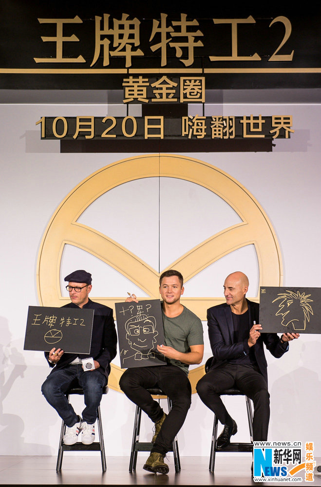 此次《王牌特工2:黃金圈》的中國行可謂亮點頗多,可以說從一落地就開始“瘋狂撩粉“。先是蛋蛋與馬強(qiáng)的機(jī)場照走紅網(wǎng)絡(luò),身穿短褲、拖鞋的隨性蛋蛋和”腿長兩米八“的馬強(qiáng)畫風(fēng)迥異,反差萌瞬間圈粉。之后,兩人又接受了霸氣十足的”黃金蟹“宴席款待,幾十只大閘蟹拼出影片logo吸睛十足,兩人還有模有樣的學(xué)起如何使用蟹八件,入鄉(xiāng)隨俗的程度可謂驚人。最大的亮點來自發(fā)布會,粉絲精心準(zhǔn)備的二次元畫作令主創(chuàng)大開眼界,既有集中國傳統(tǒng)古風(fēng)于一身的“特工奔月圖”讓人眼前一亮,也有“王牌鐵三角”黃金周中國游Q版組圖萌翻全場,眾多電影主角畫風(fēng)多變打破次元壁,引得主創(chuàng)紛紛稱贊。欣賞過粉絲畫作后,主創(chuàng)也即興上手搞起創(chuàng)作來,導(dǎo)演馬修·沃恩完美挑戰(zhàn)漢字默寫,“王牌特工2”5個漢字極其工整,引發(fā)觀眾驚呼,而蛋蛋與馬強(qiáng)則調(diào)皮十足,現(xiàn)場飛速創(chuàng)作,尤其是蛋蛋的自畫像博得一片喝彩,將氣氛引向高潮。最后,三位還獲贈了中國古代“著名特工”——錦衣衛(wèi)的令牌作為比拼獎勵,三位對禮物愛不釋手,并大擺錦衣衛(wèi)pose,古今中外的特工范兒相映成趣。最后主創(chuàng)齊邀觀眾10月20日走進(jìn)影院,解鎖這場嗨翻世界的精彩!