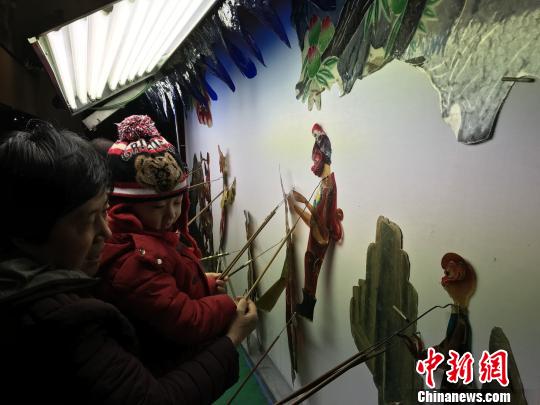 大人孩子體驗北京皮影戲劇團的皮影戲 鐘欣 攝