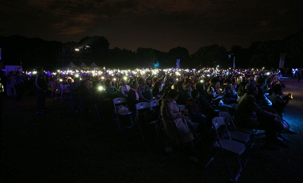 在彩虹合唱團(tuán)演出現(xiàn)場,央廣網(wǎng)記者看到,尚未到開場時(shí)間,共青森林公園已經(jīng)坐滿了觀眾,來參加的觀眾大多為青年群體,但也不乏老人以及帶著孩子的家庭。而隨著演出的進(jìn)行,臺下觀眾紛紛打開閃光燈,手機(jī)“變身”熒光棒為合唱團(tuán)“打call”。