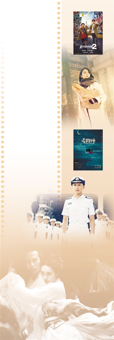 從上至下分別為電影《唐人街探案2》《超時空同居》《我不是藥神》《紅海行動》《影》的海報及劇照。制圖:蔡華偉