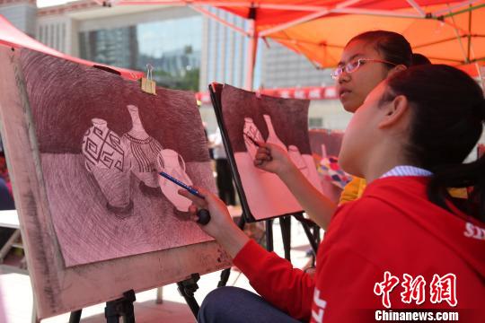 圖為青海西寧小朋友素描“指尖上”的彩陶!×_云鵬 攝