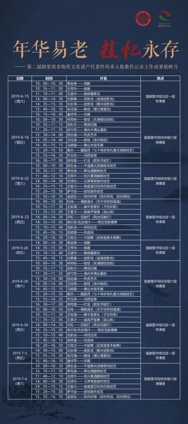 2019年6月7日—7月7日,“年華易老,技·憶永存——第二屆國(guó)家級(jí)非物質(zhì)文化遺產(chǎn)代表性傳承人搶救性記錄工作成果展映月”如期舉辦。