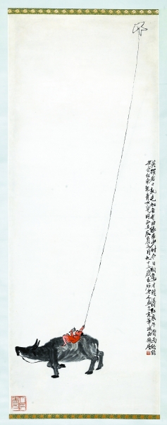 近些年伴隨國內(nèi)藝術(shù)市場不斷擴容,人們對白石老人的畫作見識愈多,善畫蝦、用色艷而不俗,幾成眾人熟悉的樣式。不過,此次在線展出作品里,卻讓人們得見一個稍顯陌生的齊白石。1952年的《紅衣牛背雨絲絲》,瘦高畫面左下角一頭水牛的背上,一個穿紅上衣的光屁股小孩兒正搖曳手中風(fēng)箏,右側(cè)居下位置有題詩:英雄名士孰先知,各有因緣在少時。今日相逢才曉得,紅衣牛背雨絲絲。這幅被視為白石兒時寫照的畫作,畫面極為素靜,空中紙鳶筆法至簡,似有意藏巧于拙。