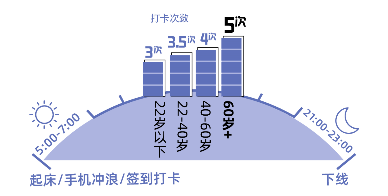 趣頭條借助平臺大數(shù)據(jù),隨機選取了100萬60歲及以上老年人樣本進行網(wǎng)絡(luò)行為分析。樣本中,男性占比48.21%,女性占比51.79%;51.12%分布在一二線城市,48.88%分布在三線以下城市。在100萬老年用戶中,大多數(shù)老年人都是在早上5-7點開始手機沖浪,上午9點達到高峰,之后回落,每個老年用戶平均一天登錄5次APP,高于其他不同年齡段的用戶。