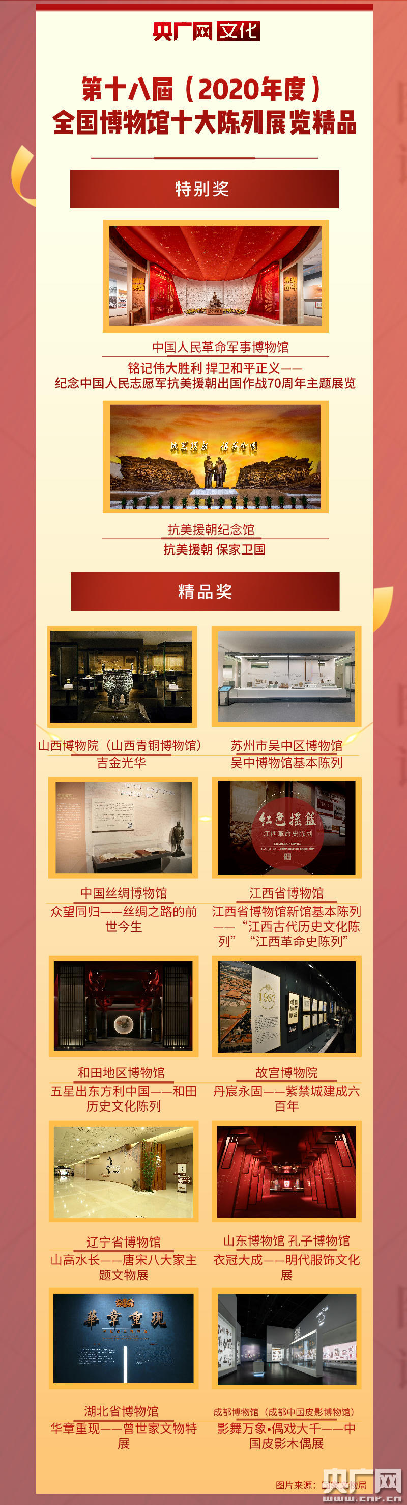 中國人民革命軍事博物館的“銘記偉大勝利 捍衛(wèi)和平正義——紀(jì)念中國人民志愿軍抗美援朝出國作戰(zhàn)70周年主題展覽”、抗美援朝紀(jì)念館的“抗美援朝 保家衛(wèi)國”榮獲特別獎(jiǎng)。