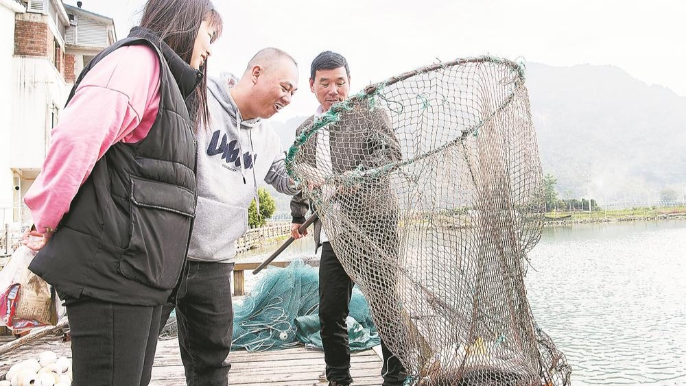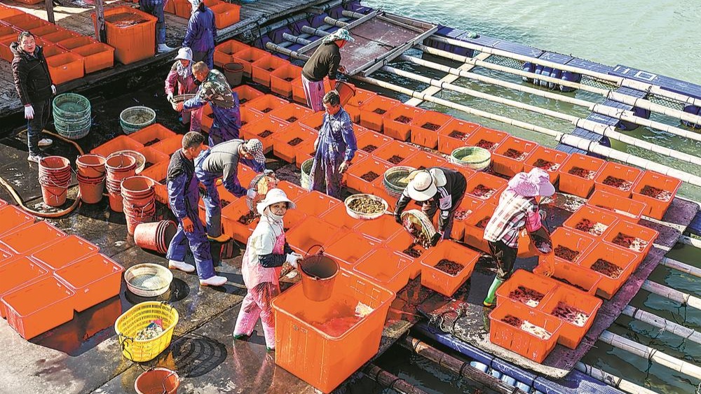 11月25日,在寧德市霞浦縣溪南鎮(zhèn)海域的漁排上,養(yǎng)殖戶將從育苗廠轉(zhuǎn)運至海上的海參苗小心投放入水。