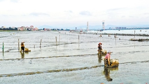 12月3日,荔城區(qū)黃石鎮(zhèn)東甲村灘涂里,漁民們趁退潮間隙播撒蟶苗。