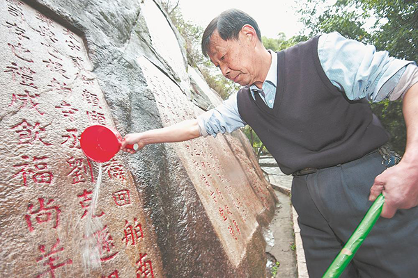九日山過去雜草叢生、污水橫流、墳?zāi)贡榈,胡家其帶人上山種樹、修路、修橋,遷走漫山的墳頭,每天起早摸黑修葺石刻。