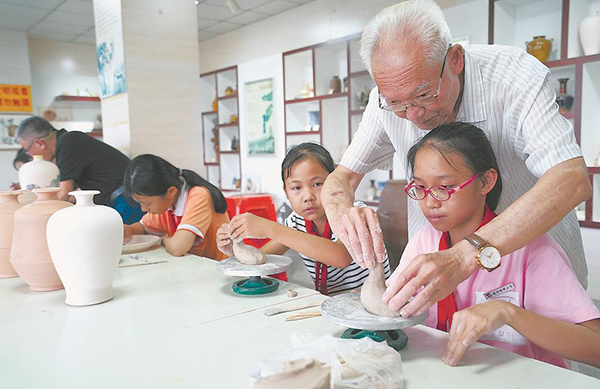 晉江市非遺代表項目磁灶陶瓷雕塑技藝傳承人吳炳峰在指導(dǎo)孩子制作陶瓷泥塑。