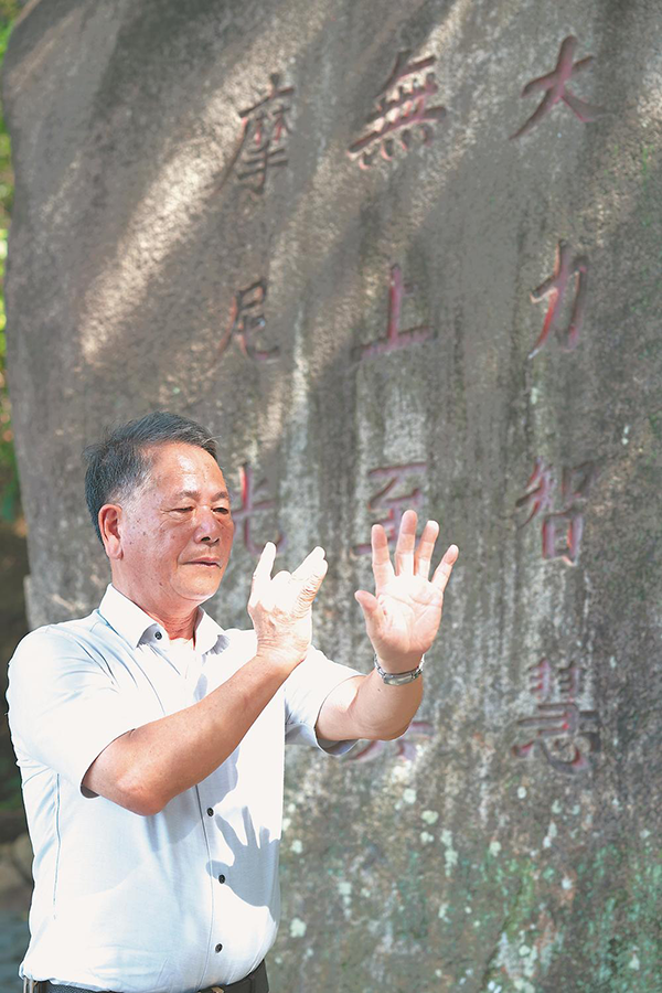 粘良圖在草庵摩尼教摩崖石刻前,展示附近村莊保留下的摩尼教手訣。