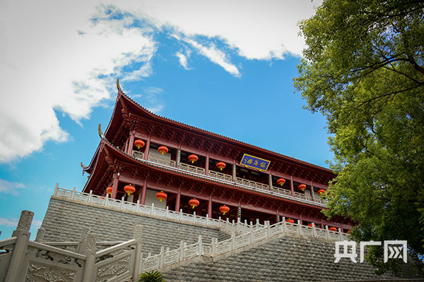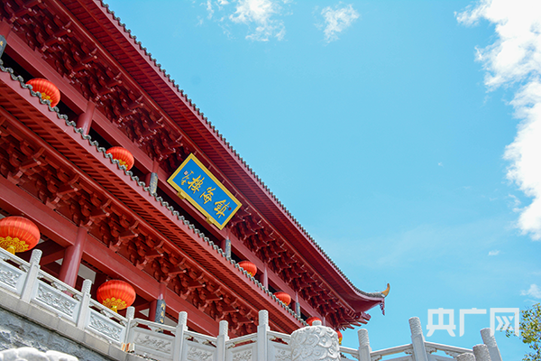 鎮(zhèn)海樓通體赤色,在藍(lán)天的映襯下顯得更加氣勢(shì)恢宏(央廣網(wǎng)發(fā) 嚴(yán)南悅攝)