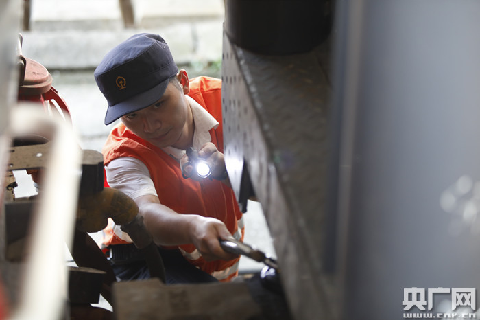 圖為顏其正在檢查機車和車輛連掛后的狀態(tài)(央廣網(wǎng)發(fā) 胡鵬 攝)