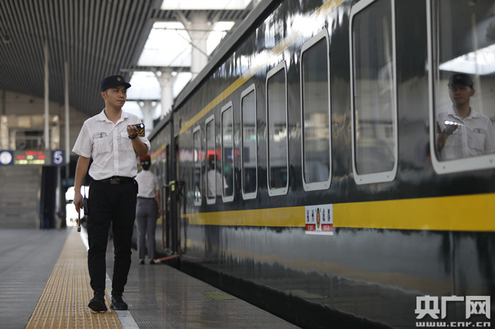 圖為顏其正在站臺上對始發(fā)列車車廂進(jìn)行檢查巡視(央廣網(wǎng)發(fā) 胡鵬 攝)