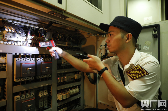 圖為顏其正在用點溫槍檢測各線路溫度是否正常(央廣網(wǎng)發(fā) 胡鵬 攝)