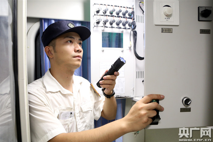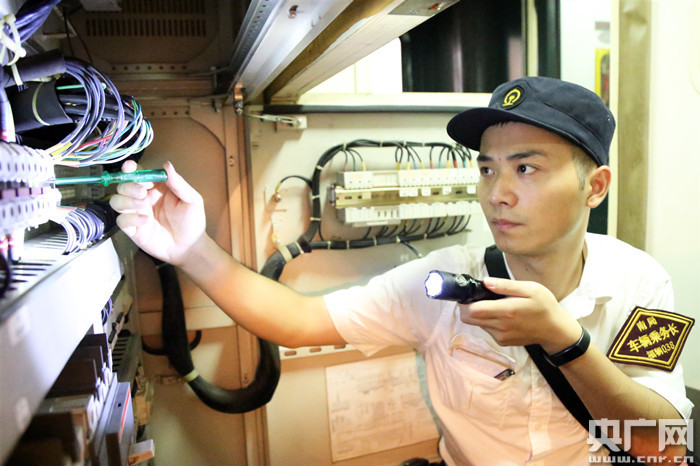 圖為顏其正在對車廂各項設(shè)備設(shè)施進(jìn)行巡視檢查(央廣網(wǎng)發(fā) 王玉星 攝)