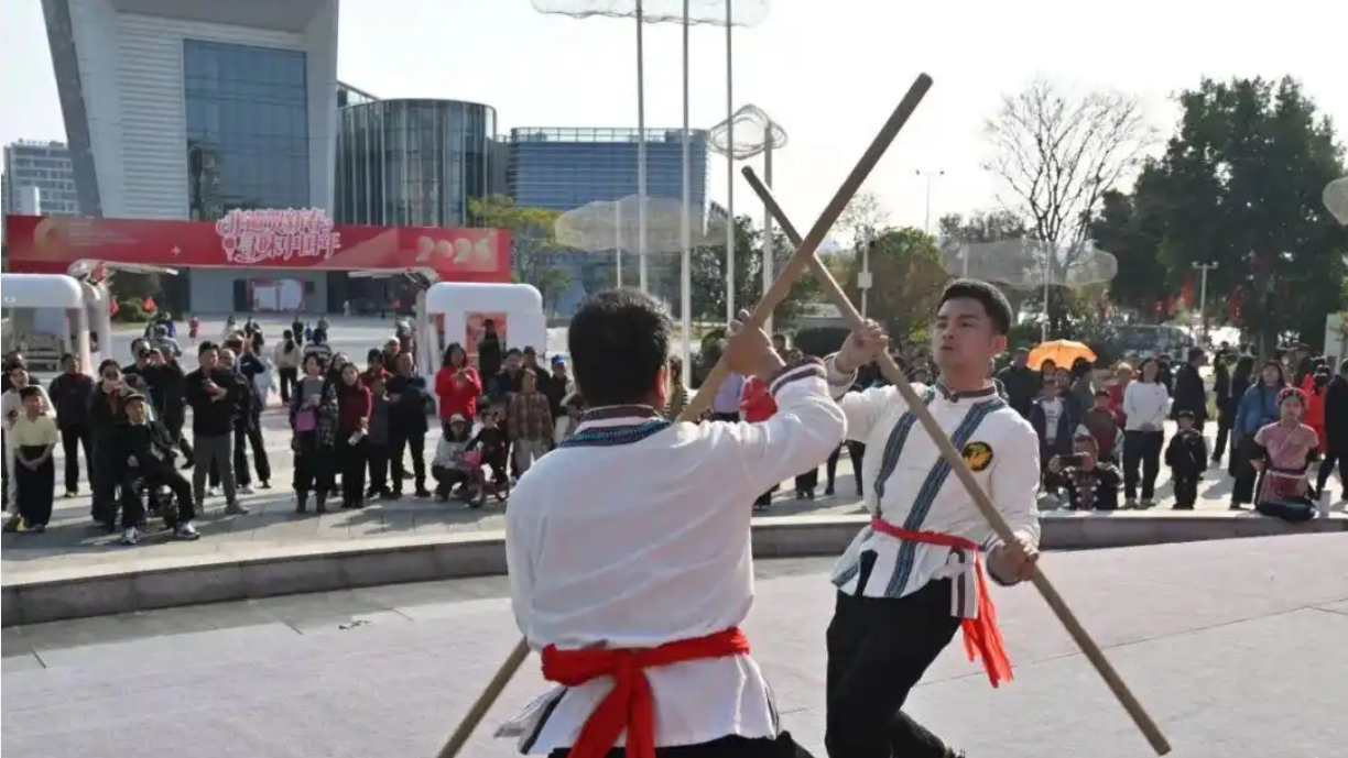 在今年元宵節(jié)前夕的福州非遺主題活動(dòng)中,羅源松山鎮(zhèn)八井村的畬族小伙雷明與叔叔雷知坤一同現(xiàn)身上下杭展示八井拳及棍術(shù)對(duì)練,吸引了眾多市民游客。
