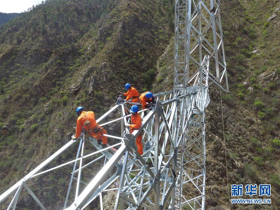5月19日,在西藏林芝市米林縣臥龍鎮(zhèn)雅魯藏布江南岸的山脊上,國(guó)家電網(wǎng)陜西送變電工程公司的職工在組塔。 藏中聯(lián)網(wǎng)工程由西藏藏中電網(wǎng)與昌都電網(wǎng)聯(lián)網(wǎng)工程、川藏鐵路拉薩至林芝段500千伏供電工程兩部分組成,工程總投資162億元,于2017年4月6日正式開(kāi)工。目前,工程已進(jìn)入組塔階段,計(jì)劃2018年建成投運(yùn)。新華社發(fā)(任長(zhǎng)征 攝)