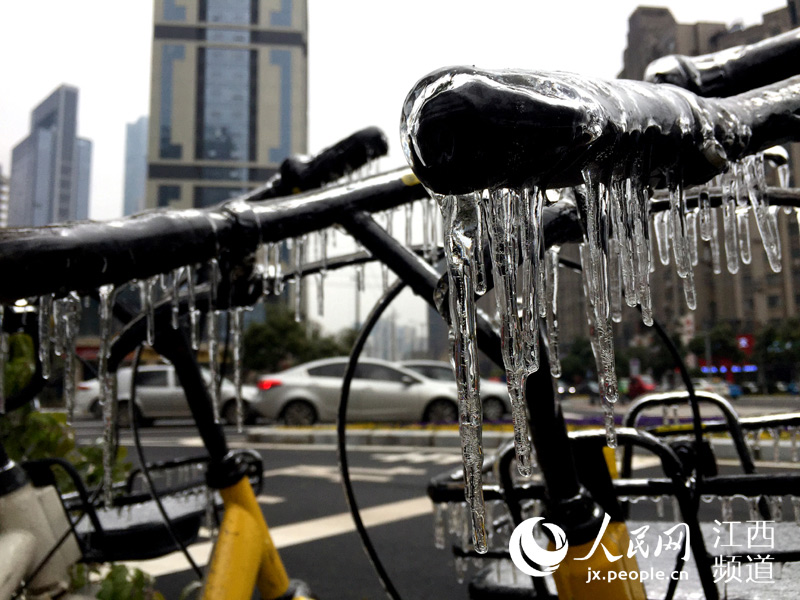 人民網南昌1月28日電(時雨)連日來,南昌遭遇低溫凍雨天氣,夜間的溫度跌至0℃以下。28日,本網在南昌街頭看到,低溫加凍雨使戶外的物體裹上了厚厚的“冰衣裳”,散落在街頭的各類共享單車不少已經成為“冰雕”,車把手、車筐甚至車輪胎都結了冰,這些被“冰封”的共享單車停靠在路邊無人問津。