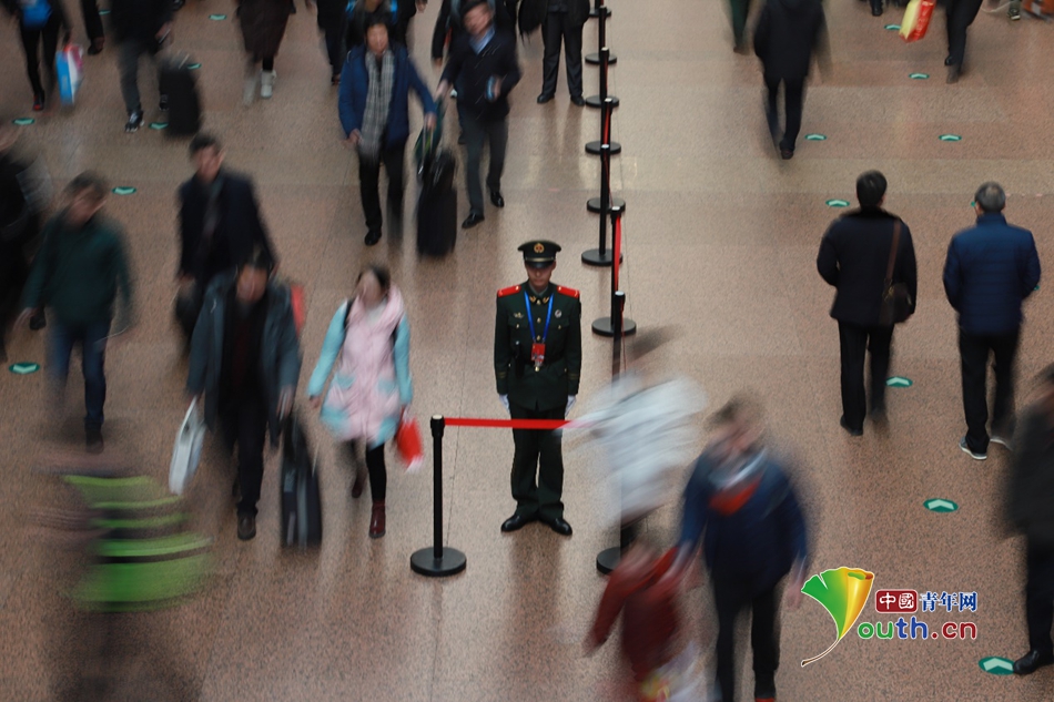 中國(guó)青年網(wǎng)北京2月2日電(記者 孫釗 通訊員 馬浚鑫 張?chǎng)锡垼?月1日,春運(yùn)大幕正式開啟,全國(guó)各地的火車站、汽車站、客運(yùn)站都迎來了一年之中的客流峰值。為了維護(hù)車站秩序、幫助歸心似箭的游子們順暢、安全地踏上回家的火車,成千上萬名武警戰(zhàn)士選擇成為“不回家的人”,為春運(yùn)大軍保駕護(hù)航。 每天見著不同的人,卻做著同樣的事……單人執(zhí)勤時(shí)間每日超過8小時(shí)的他們?cè)缫褜④囌韭窙r、車次時(shí)間、候車方向背記得滾瓜爛熟。 -