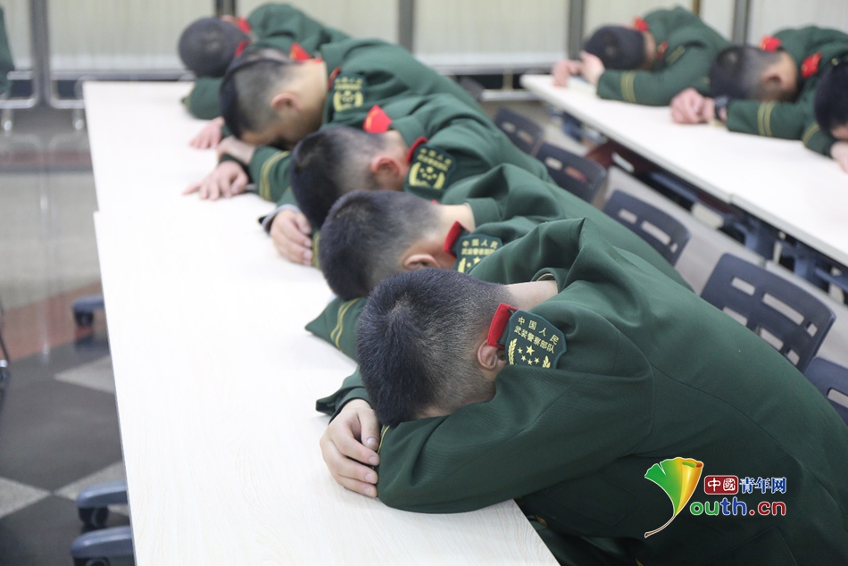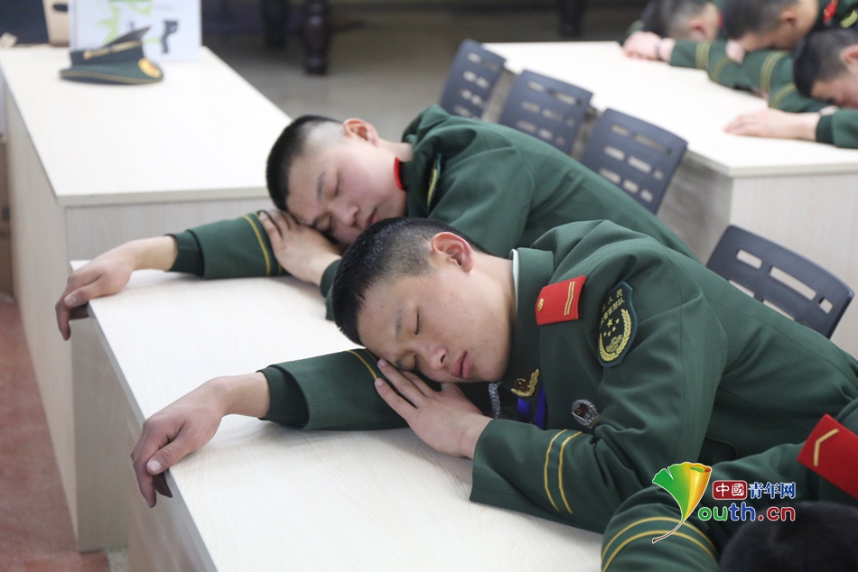 從早上7時(shí)到晚上12時(shí),執(zhí)勤官兵們每天近18個(gè)小時(shí)的執(zhí)勤時(shí)間讓他們略顯疲憊,執(zhí)勤時(shí),他們拿出最好狀態(tài),休息時(shí),他們只能倚靠在椅子上稍事休息,但不出3分鐘,就有人睡著了。于是,就誕生了形形色色的睡姿。 -