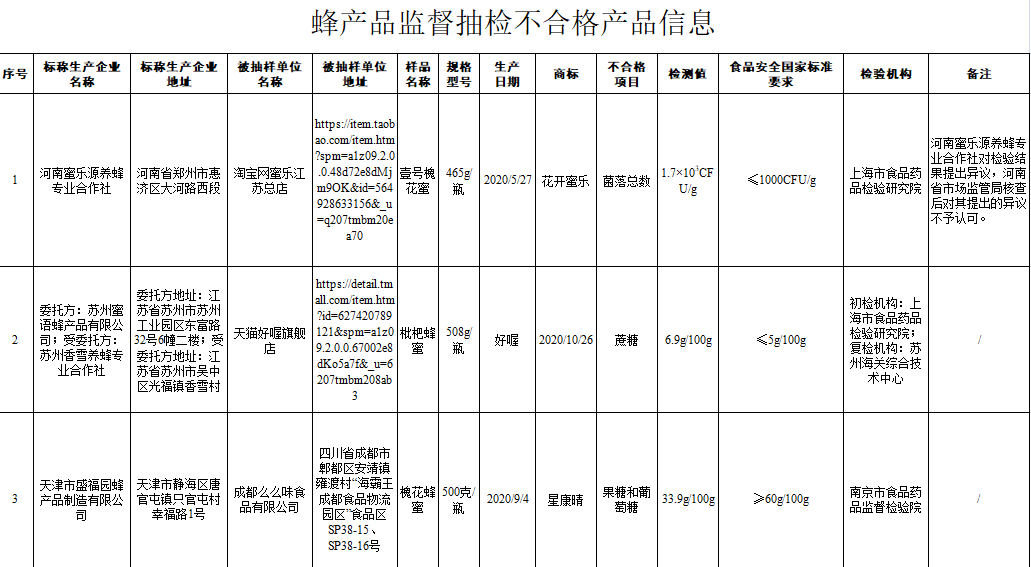 《通告》顯示,商標名稱為“花開蜜樂”、標稱河南蜜樂源養(yǎng)蜂專業(yè)合作社生產(chǎn)的壹號槐花蜜,經(jīng)上海市食品藥品檢驗研究院檢驗發(fā)現(xiàn),其中菌落總數(shù)不符合食品安全國家標準規(guī)定。河南蜜樂源養(yǎng)蜂專業(yè)合作社對檢驗結果提出異議,河南省市場監(jiān)管局核查后對其提出的異議不予認可。